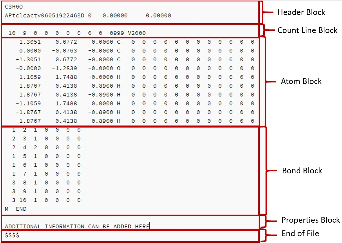 9 8 0 0 0 0 0 0 0 0999 V2000 1.2854 -0.2499 -0.0000 C 0 0 0 0 0 0 0 0 0 0 0 0 -0.0072 0.5687 -0.0000 C 0 0 0 0 0 0 0 0 0 0 0 0 -1.1304 -0.3147 0.0000 O 0 0 0 0 0 0 0 0 0 0 0 0 1.3175 -0.8784 0.8900 H 0 0 0 0 0 0 0 0 0 0 0 0 1.3175 -0.8784 -0.8900 H 0 0 0 0 0 0 0 0 0 0 0 0 2.1422 0.4239 -0.0000 H 0 0 0 0 0 0 0 0 0 0 0 0 -0.0392 1.1972 0.8900 H 0 0 0 0 0 0 0 0 0 0 0 0 -0.0392 1.1972 -0.8900 H 0 0 0 0 0 0 0 0 0 0 0 0 -1.9857 0.1365 -0.0000 H 0 0 0 0 0 0 0 0 0 0 0 0 1 2 1 0 0 0 0 2 3 1 0 0 0 0 1 4 1 0 0 0 0 1 5 1 0 0 0 0 1 6 1 0 0 0 0 2 7 1 0 0 0 0 2 8 1 0 0 0 0 3 9 1 0 0 0 0M END$$$$Tots els molfiles tenen un encapçalament i una taula de connexions (CTAB) amb dos blocs principals: Atom Block i Bond Block.