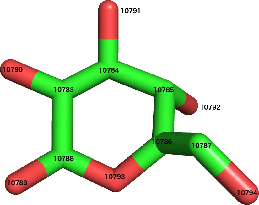 En el residu BGC anterior, cada àtom està etiquetat pel seu número de sèrie. Ara podem veure que l’àtom 10783 està connectat als àtoms 10784, 10788 i 10790.