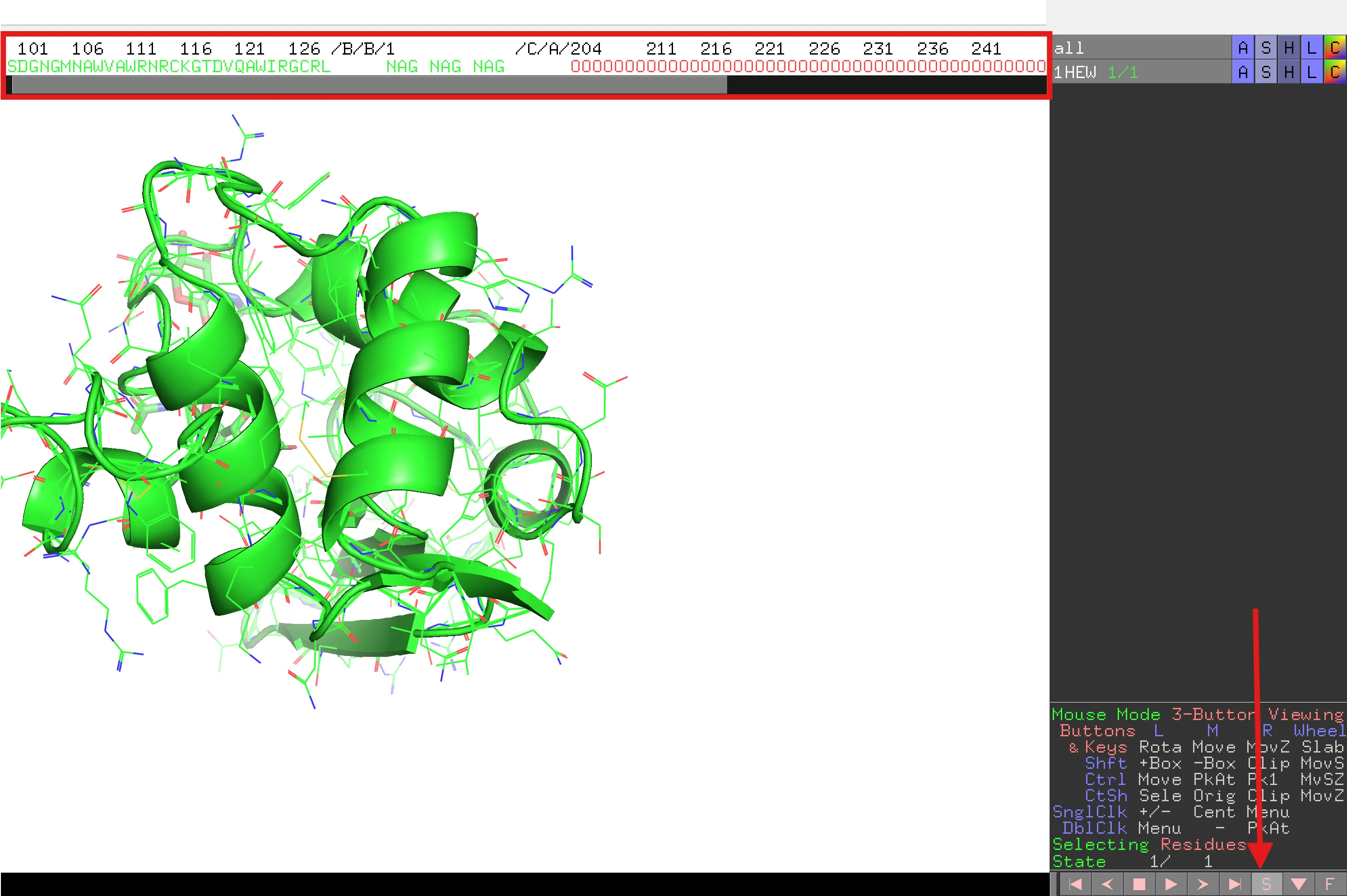 Display > Sequence Mode > All Residue Numbers. - Select one residue from the sequence panel, for example His64 (or any histidine near the heme).