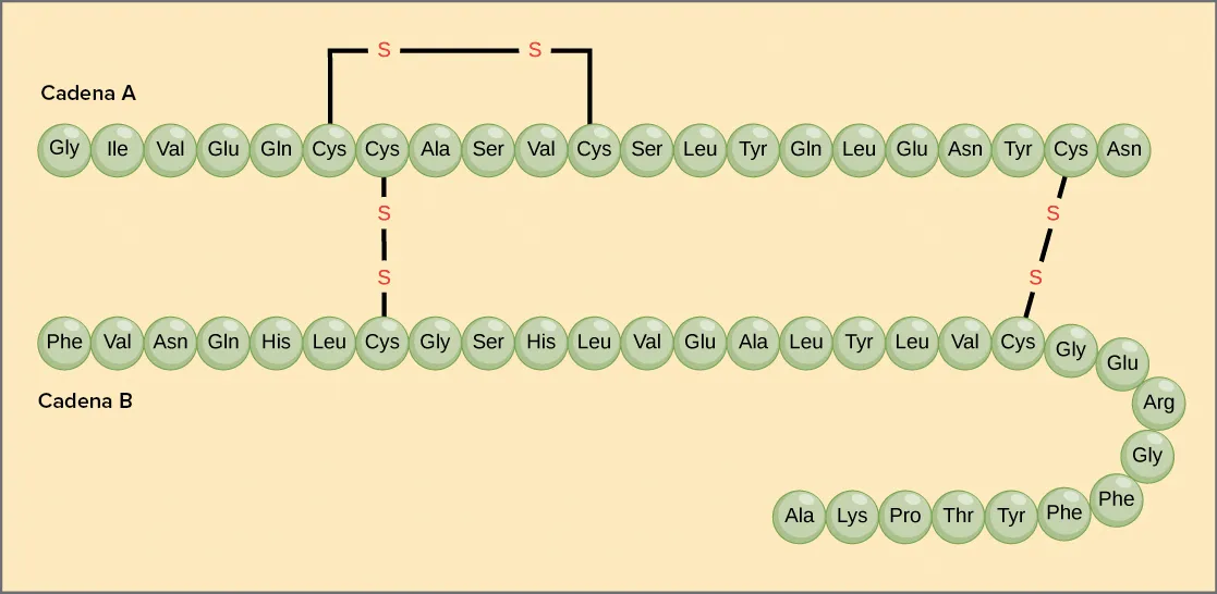Cada cadena té el seu conjunt d’aminoàcids, ensamblats en un ordre determinat. Per exemple, la seqüència de la cadena A comença amb una glicina a l’extrem N-terminal i acaba amb una asparagina a l’extrem C-terminal i és diferent de la seqüència de la cadena B.