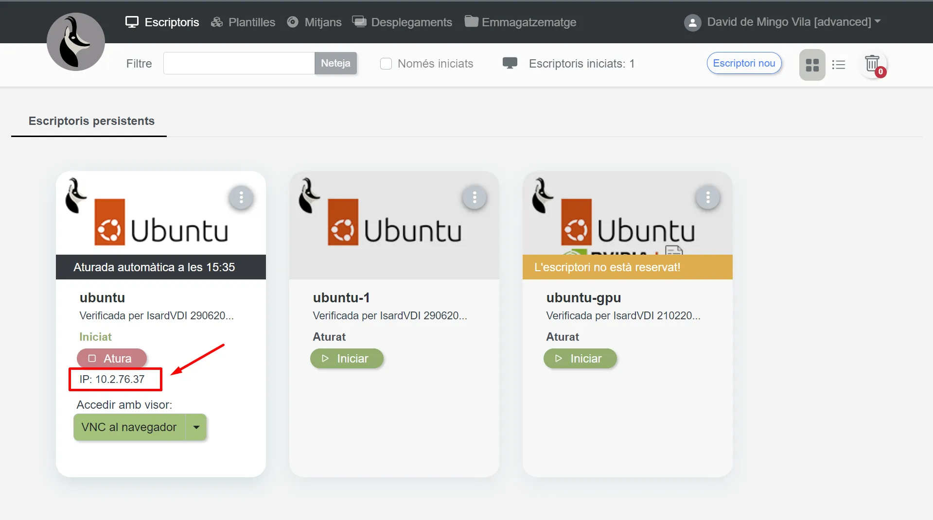 $ ping -c 1 10.2.76.37PING 10.2.76.37 (10.2.76.37) 56(84) bytes of data.64 bytes from 10.2.76.37: icmp_seq=1 ttl=63 time=47.4 ms...Et pots connectar a la màquina d’Isard amb SSH tal com s’explica a Network - SSH.