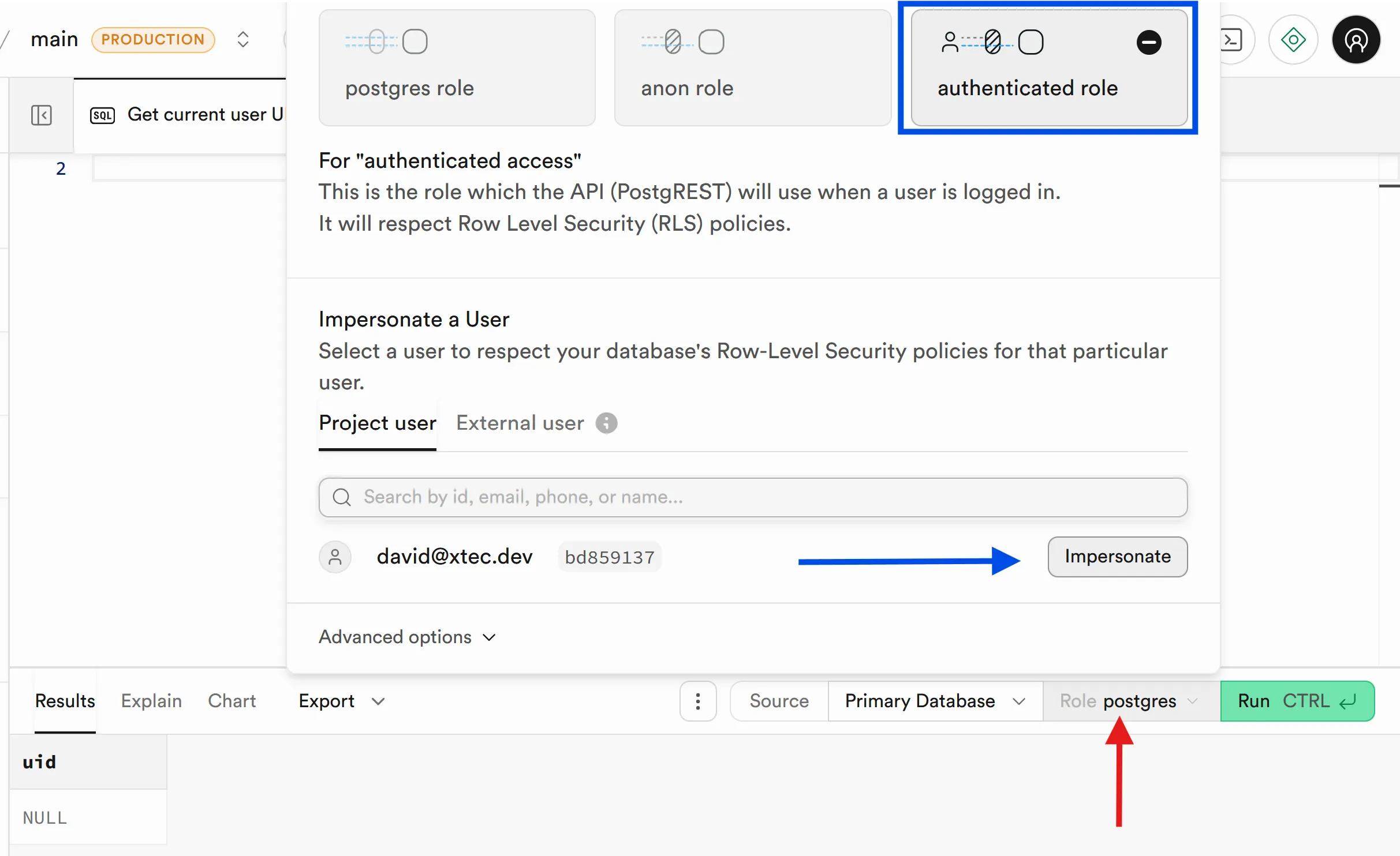 Now run again the auth.uid() query and you will see that it returns the ID of the user you selected.