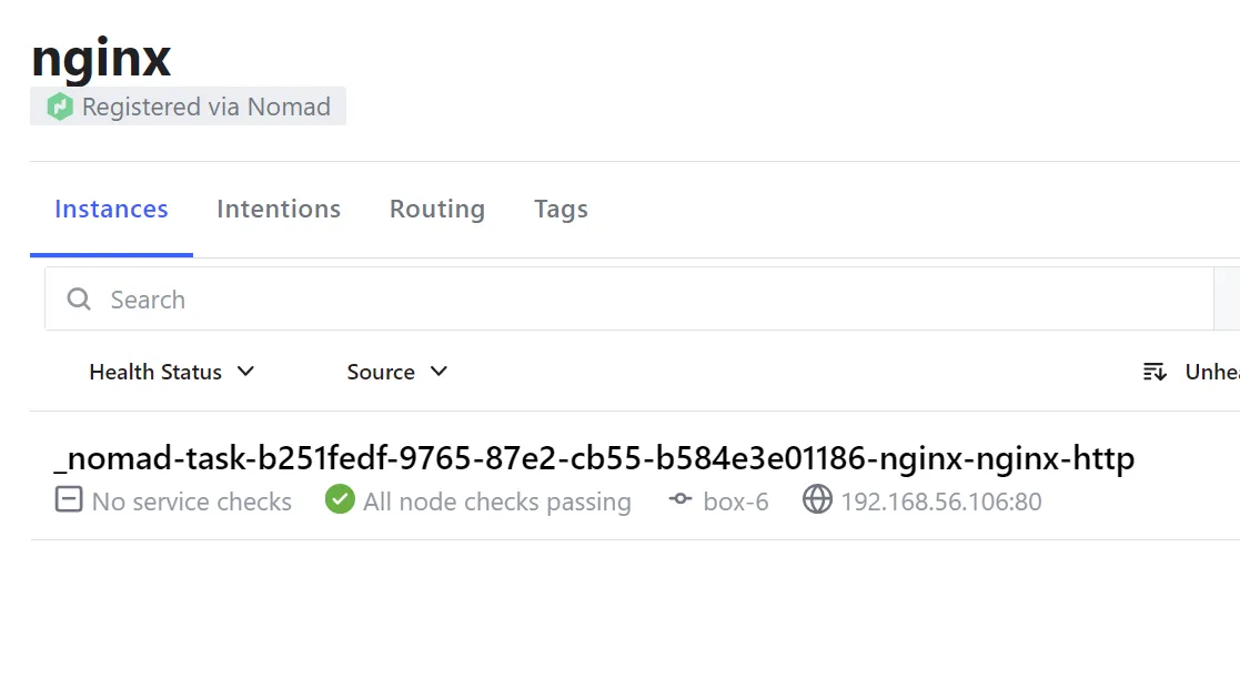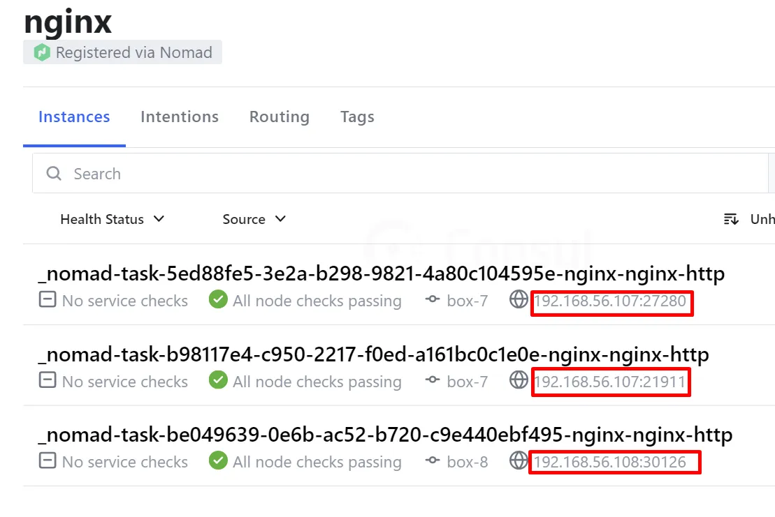 job "nginx" { datacenters = ["dc1"] group "nginx" { count = 3 network { port "http" { static = 80 to = 80 } }Registra el job actualitzat i verifica amb Consul que tots els serveis nginx estan al port 80.