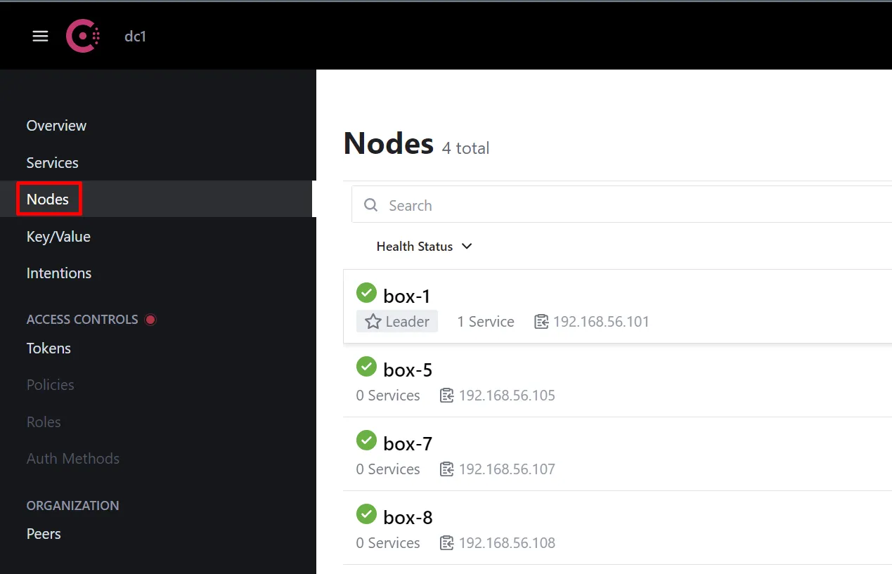Node Address Status Type Build Protocol DC Partition Segmentbox-1 192.168.56.101:8301 alive server 1.14.4 2 dc1 default <all>box-5 192.168.56.105:8301 alive client 1.14.4 2 dc1 default <default>box-7 192.168.56.107:8301 alive client 1.14.4 2 dc1 default <default>box-8 192.168.56.108:8301 alive client 1.14.4 2 dc1 default <default>També pots utilitzar la interfície gràfica: http://192.168.56.15:8500