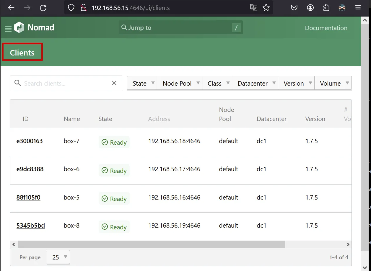 La pàgina de clients proporciona una vista classificable i filtrable dels agents de client Nomad. Podeu consultar els detalls d’un client individual des d’aquesta pàgina de llista.