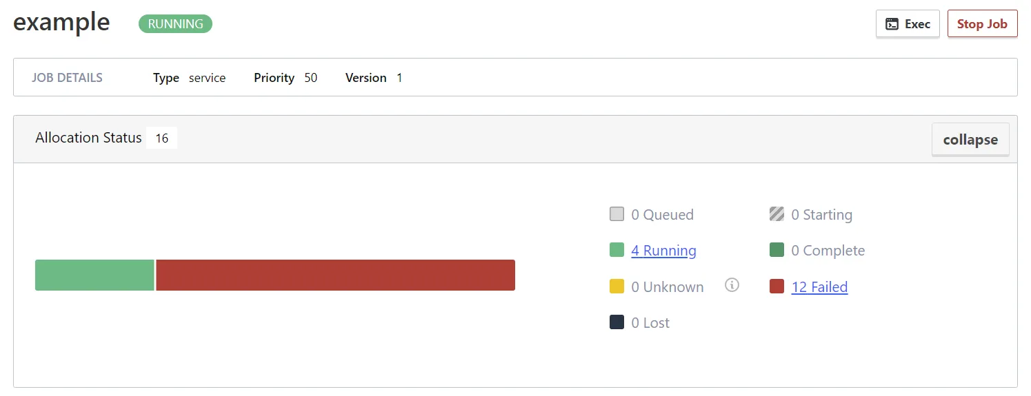 La interfície web Nomad proporciona una vista de la topologia del clúster i la càrrega de treball en execució. En entorns més complexos, aquesta vista et pot ajudar a entendre on i com s’executen les càrregues de treball, i et proporciona una visió d’alt nivell de la capacitat de clúster utilitzada i disponible.