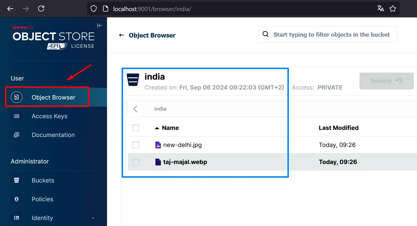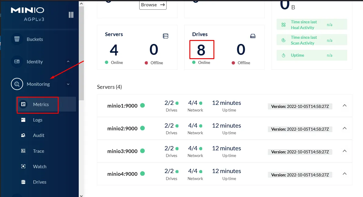 $docker psCONTAINER ID IMAGE COMMAND CREATED STATUS PORTS NAMESf5febb38a40d nginx:1.19.2-alpine "/docker-entrypoint.…" 2 minutes ago Up 2 minutes 80/tcp, 0.0.0.0:9000-9001->9000-9001/tcp, :::9000-9001->9000-9001/tcp docker-nginx-10cb9aff8e283 minio/minio:RELEASE.2023-10-16T04-13-43Z "/usr/bin/docker-ent…" 2 minutes ago Up 2 minutes (healthy) 9000-9001/tcp docker-minio4-1423e2031fe26 minio/minio:RELEASE.2023-10-16T04-13-43Z "/usr/bin/docker-ent…" 2 minutes ago Up 2 minutes (healthy) 9000-9001/tcp docker-minio3-1ea5e9ef653d2 minio/minio:RELEASE.2023-10-16T04-13-43Z "/usr/bin/docker-ent…" 2 minutes ago Up 2 minutes (healthy) 9000-9001/tcp docker-minio1-1ae4ec2bc445e minio/minio:RELEASE.2023-10-16T04-13-43Z "/usr/bin/docker-ent…" 2 minutes ago Up 2 minutes (healthy) 9000-9001/tcp docker-minio2-1Obre la consola http://localhost:9000