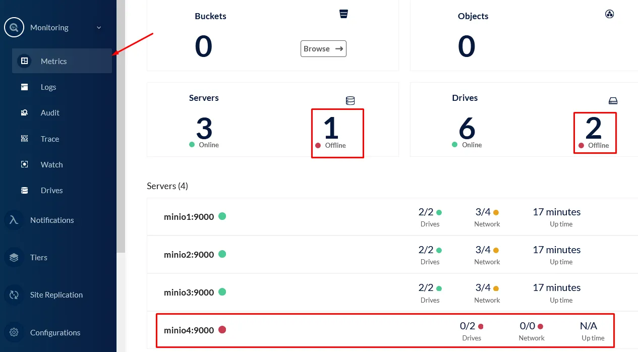 $ docker stop docker-minio4-1Si mires la consola pots veure que apareix que un servidor està caigut.