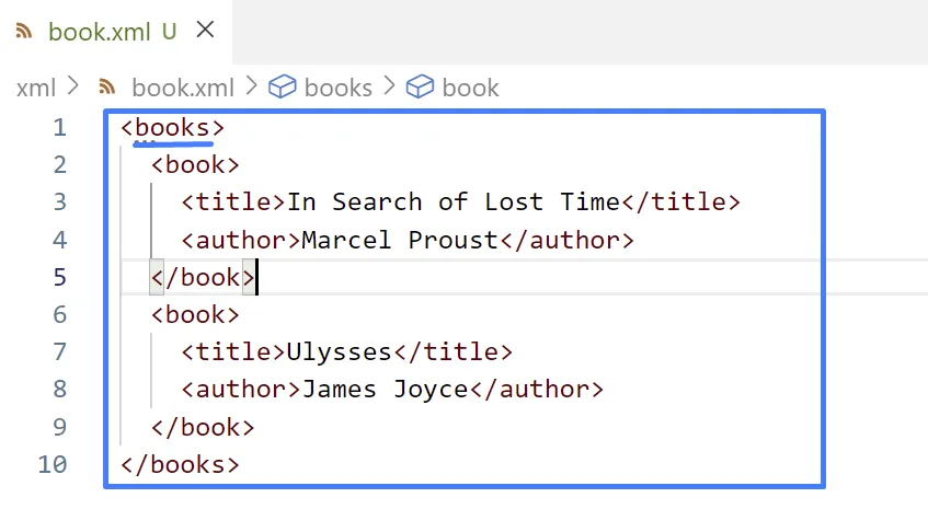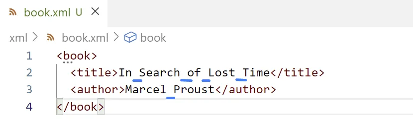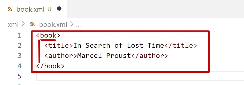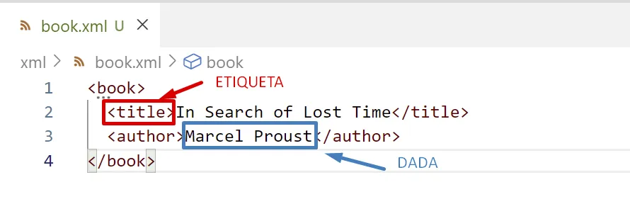 <?xml version="1.0" ?><book> <title>In Search of Lost Time</title> <author>Marcel Proust</author></book>Un document XML sempre comença amb els caràcters <?xml (< és el primer caràcter del fitxer).