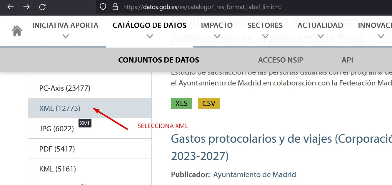 Fes clic en “Mostrar más” per poser seleccionar dades en XML: