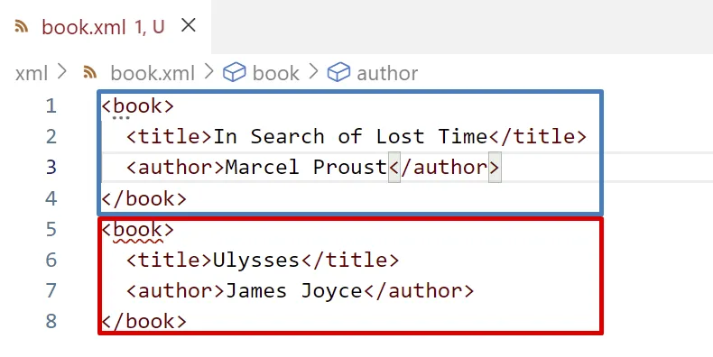 La solució és afegir un element pare dels dos elements <book> :