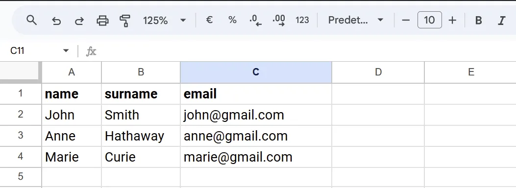 | Marie | Curie | marie@gmail.com |