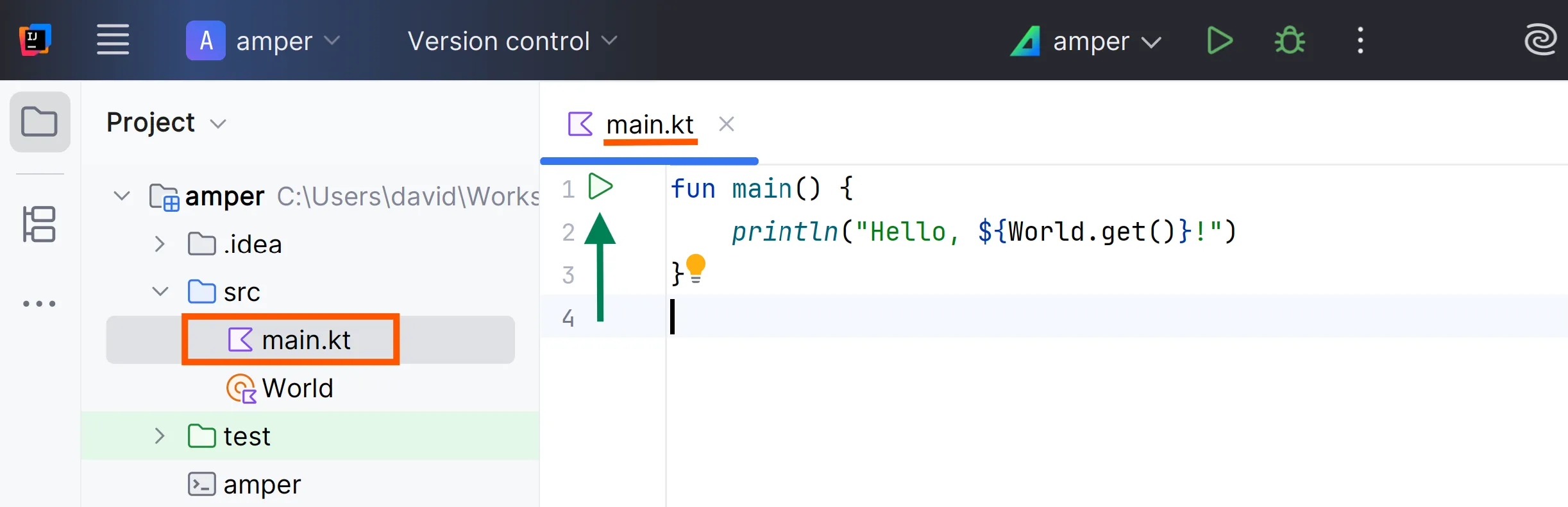 També pots utilitzar la icona ‘run’ ( ) al costat de la funció main()