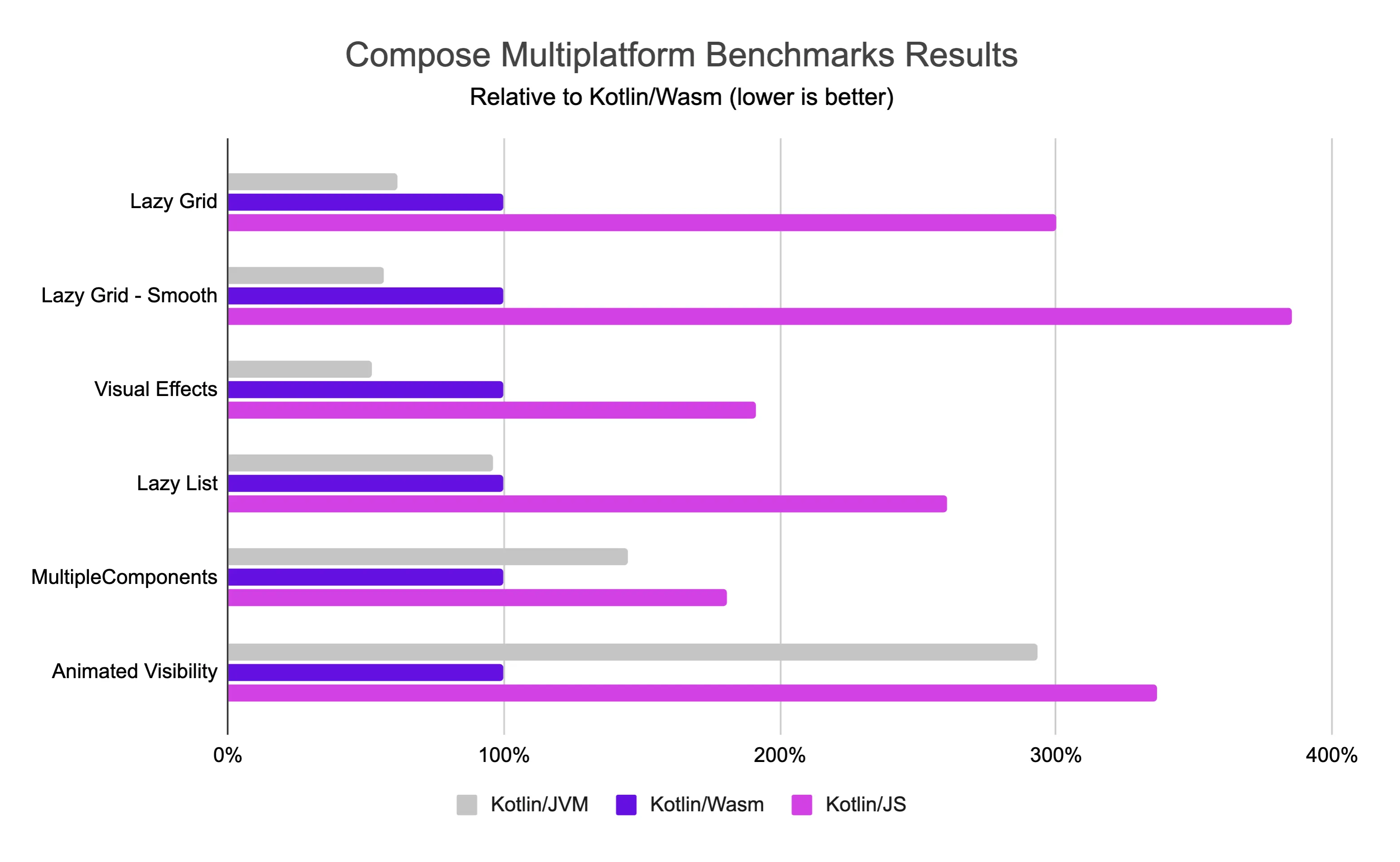 Although Kotlin/Wasm is still in Beta, Compose Multiplatform running on Kotlin/Wasm already shows encouraging performance traits. You can see that its execution speed outperforms JavaScript and is approaching that of the JVM: