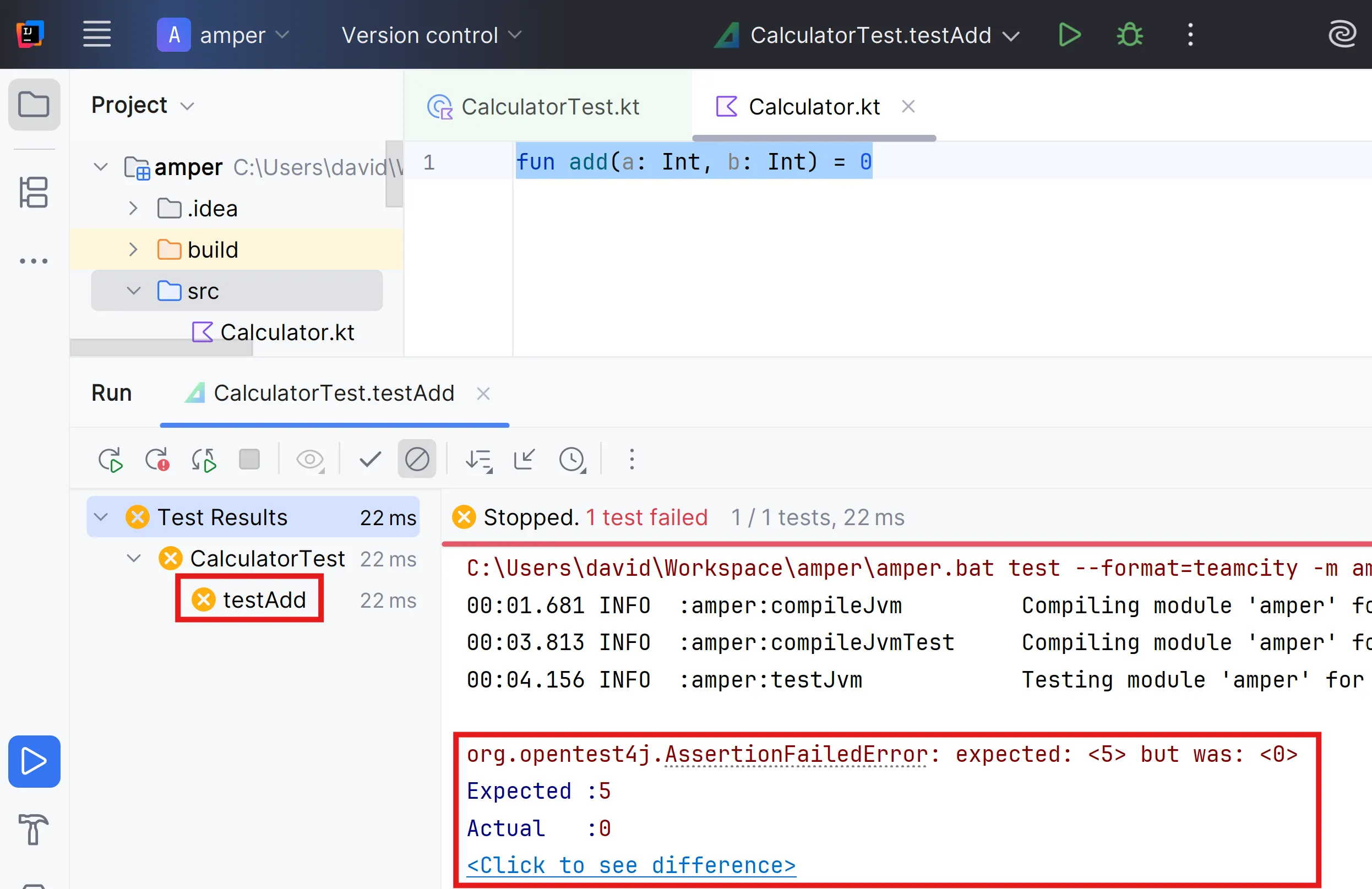 fun add(a: Int, b: Int) = 0Ara si executes el test, l’error és diferent, però el programa funciona!! 😺