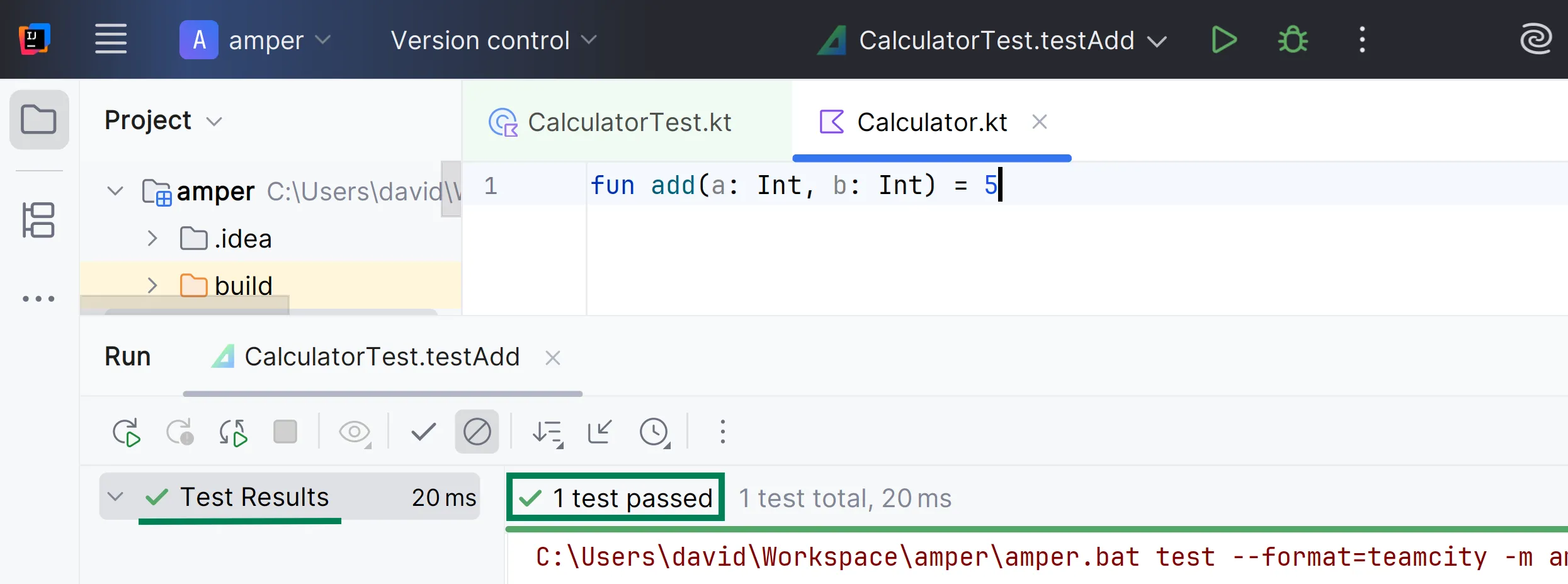 import Calculator.addimport kotlin.test.Testimport kotlin.test.assertEquals@Testfun testAdd() { assertEquals(5, add(2, 3)) assertEquals(10, add(5, 5))}I pots veure que no està ben implementada: