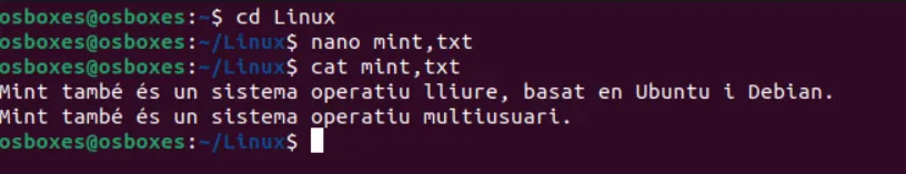 echo "Debian és un sistema operatiu lliure, creat l’any 1993 per Ian Murdock." > debian.txtecho "Mint també és un sistema operatiu lliure, basat en Ubuntu i Debian." >> mint.txtecho "Mint també és un sistema multiusuari." >> mint.txtcat mint.txt debian.txt >> total.txtExercici 4.2