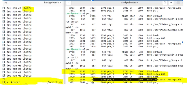 Pas 0. Obriu 2 terminals, un per executar l’script i l’altre per aplicar el ps per veure l’estat dels perfils.