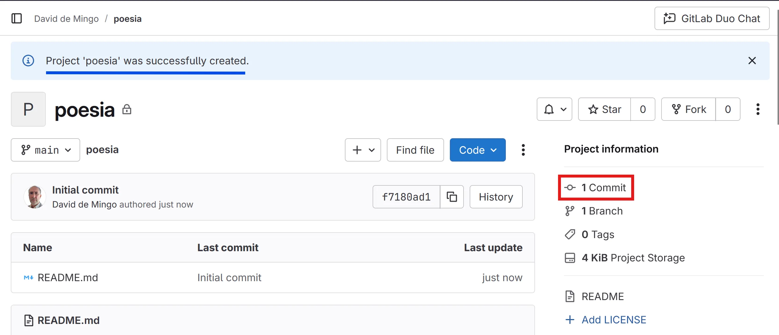 git clone git@gitlab.com:ddemingo/poesia.gitCloning into 'poesia'...remote: Enumerating objects: 3, done.remote: Counting objects: 100% (3/3), done.remote: Compressing objects: 100% (2/2), done.remote: Total 3 (delta 0), reused 0 (delta 0), pack-reused 0 (from 0)Receiving objects: 100% (3/3), done.Ja pots escriure la primera estrofa de la teva primera poesia: