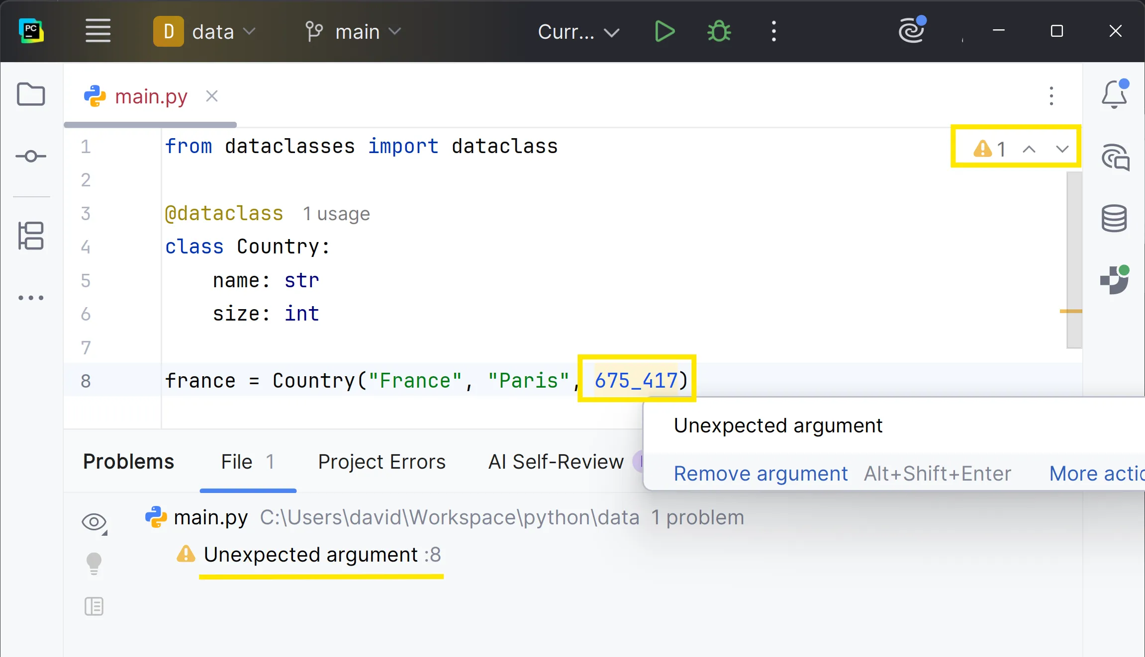 france = Country("France", "Paris", 675_417) france = Country("France", "Paris", 675_417)TypeError: Country.__init__() takes 3 positional arguments but 4 were givenI també molt important, la IDE t’avisa de que el dataclass Country només té tres atributs: