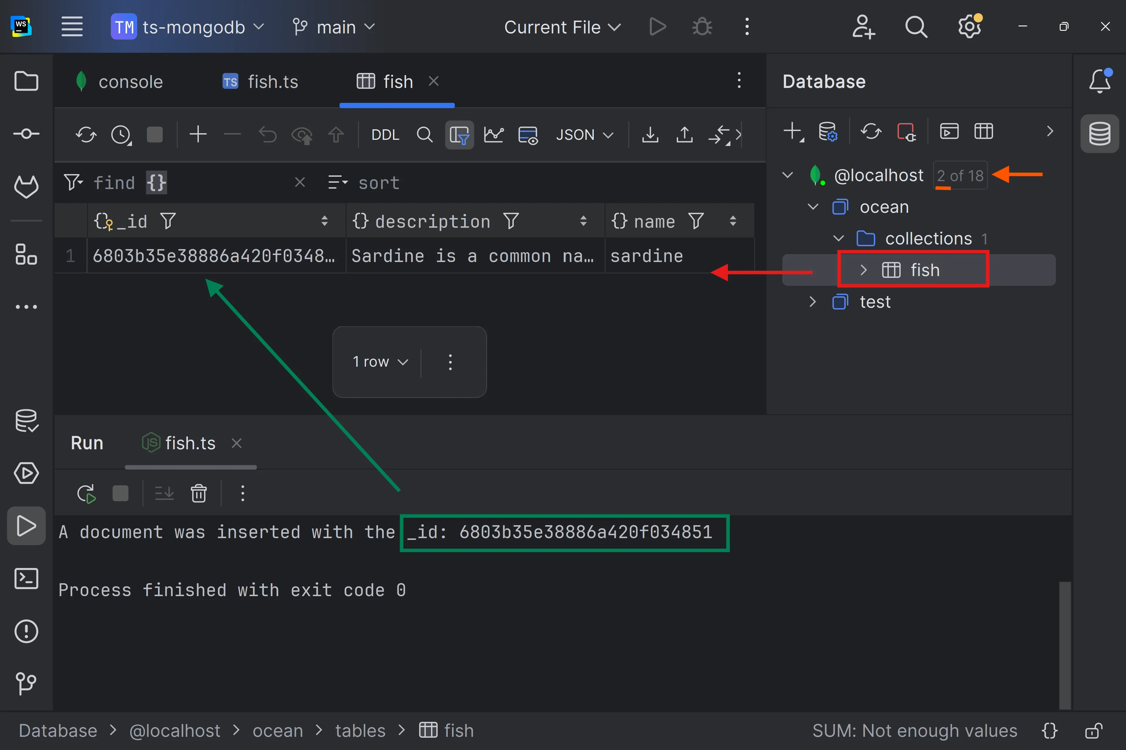 bun fish.tsL’script insereix el peix i mostra per consola la _id del document que acabes d’inserir.