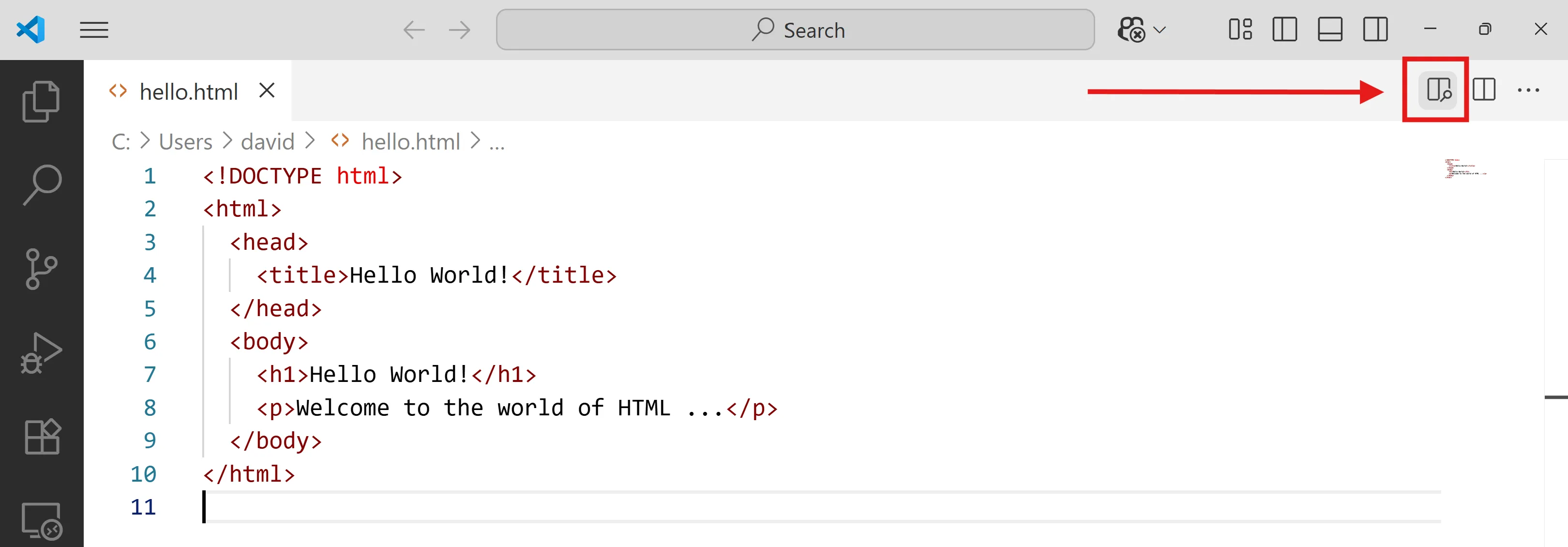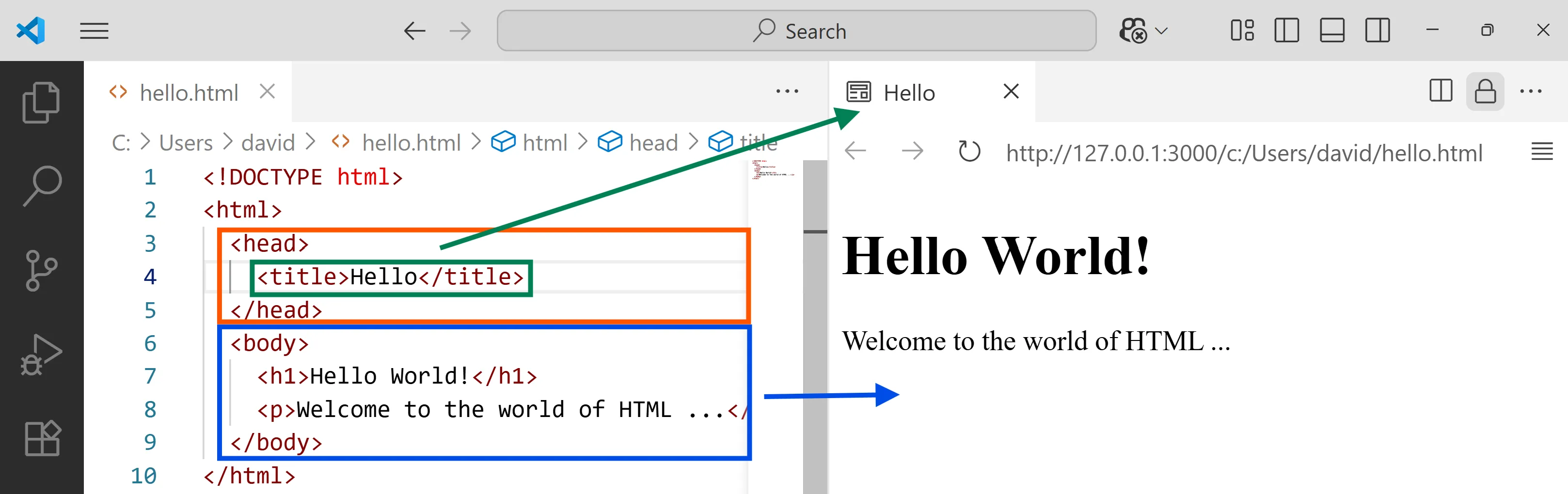 <!DOCTYPE html><html> <head> <title>Hello World!</title> </head> <body> <h1>Hello World!</h1> <p>Welcome to the world of HTML ...</p> </body></html>Copia el contingut del document HTML al fitxer hello.html que has creat.