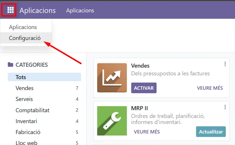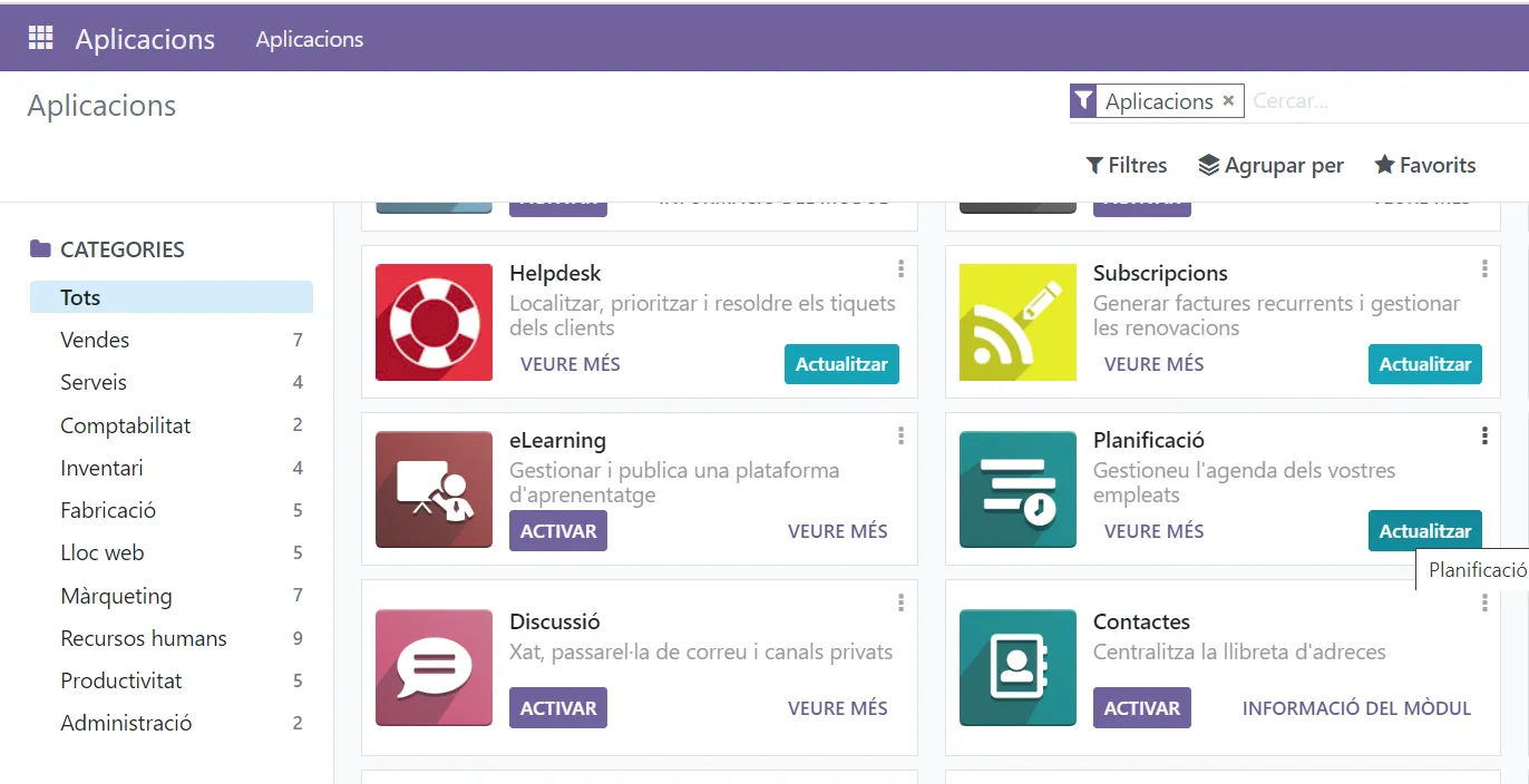 Com pots veure Odoo consisteix en un conjunt d’aplicacions que es poden activar ( i actualitzar):