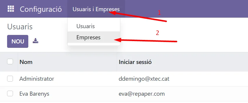 Important!. No has de crear una empresa nova perquè la versió gratuïta d’Odoo no permet crear departaments en altres empreses que no siguin la principal.
