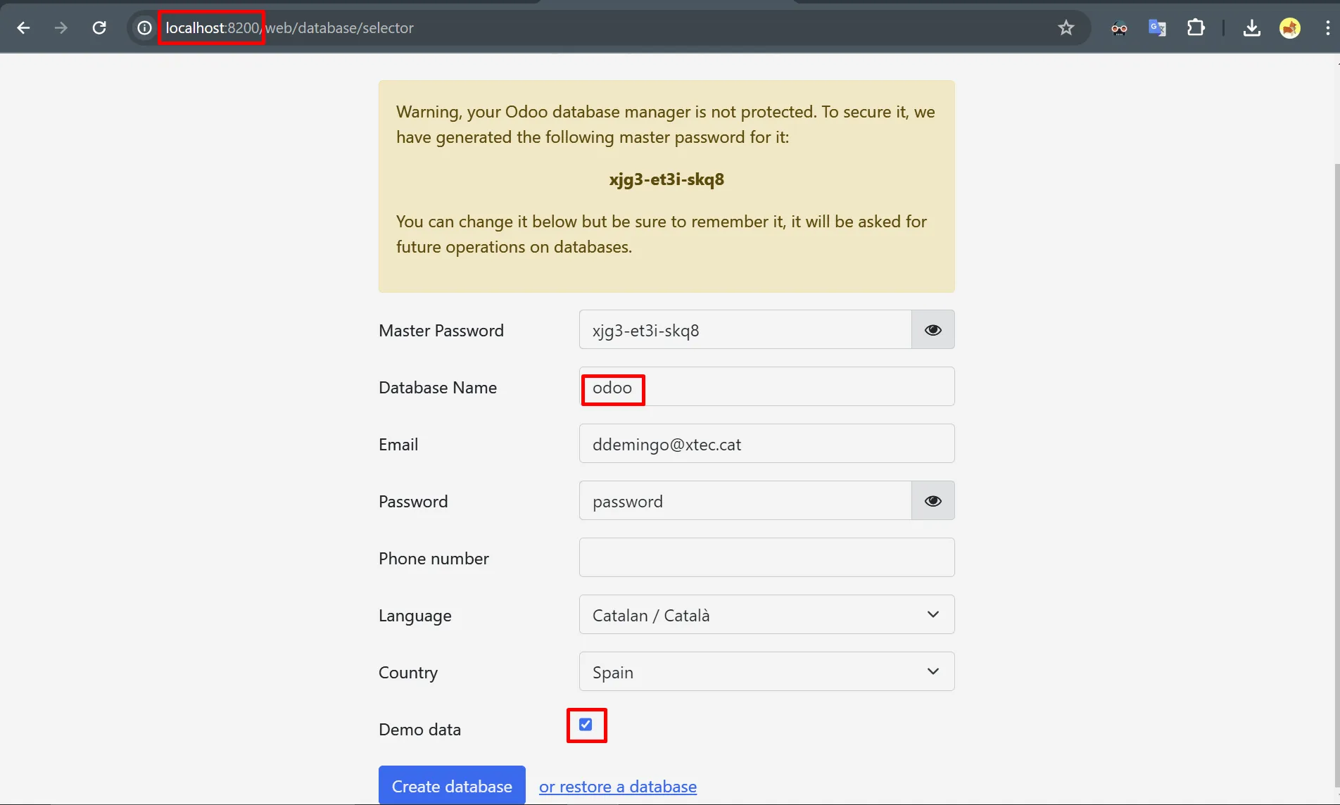 Selecciona que es creïn dades de demostració.